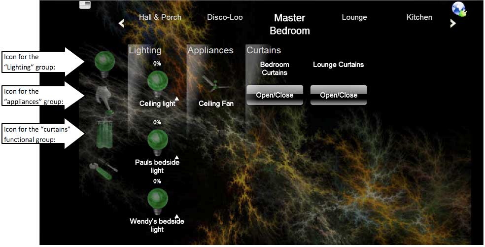 As a result of the above, the Wiser automatically builds a web page containing all the items you added. The locations appear as a strip along the top, and the functional groups appear as a column down the left. The icons are the ones I chose from the default set available in PICED when I added those functional groups, although you can of course get it to use pretty much any graphics you want.
