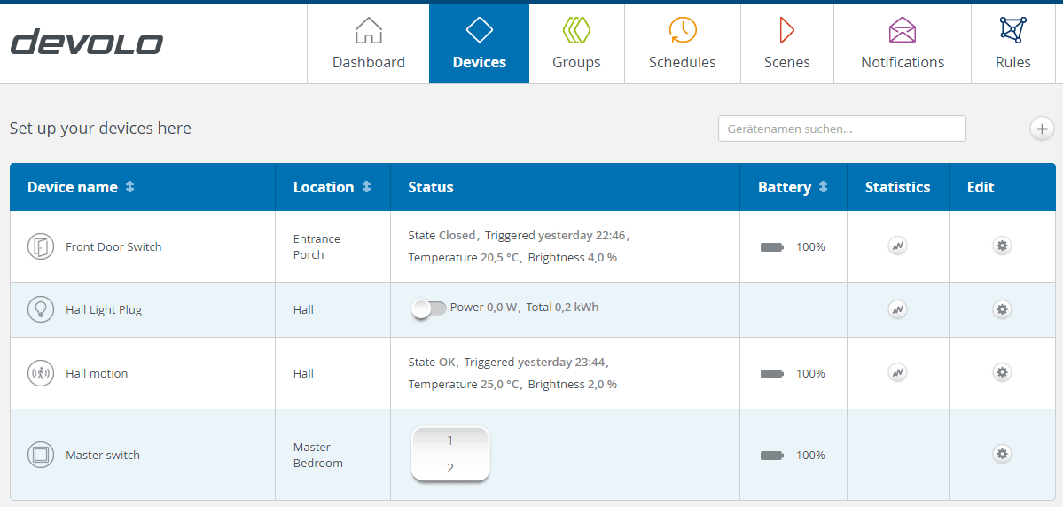One thing that does strikes us is that as the system expands the device page will become long and busy. It is possible to alphabetically sort devices by location but here is a tip if you are going to have lots of locations. Start each location with a number i.e. 01 Lounge, 02 Hall, 03 Kitchen this will allow you to build a logical sequence of locations rather than an alphabetical list. This way you will see the devices in a recognisable order and the room you interact most with will be on top. A development idea for Devolo is a ‘smart home view’ that would allow users to build a map of their property and see the status of each room or devices in that room, this would make the system much more intuitive. Here is a scenario – A quick look at my smart home plan and I see the garage door is open and the kitchen window is open and someone has left the study lights on.
