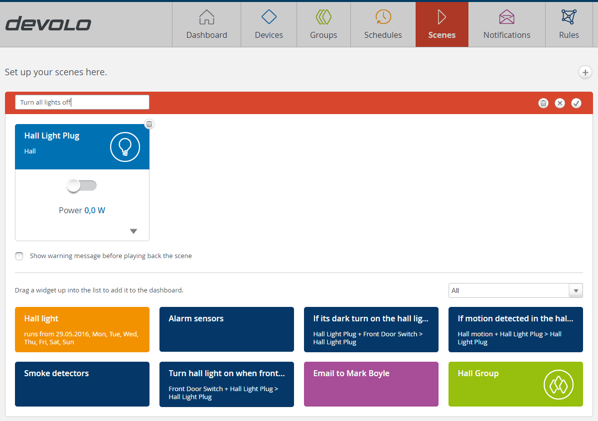 Scenes is akin to writing a macro. You can add multiple Devices, Rules, Schedules, Groups or Notifications. We found ourselves thinking of multiple examples, a ‘Leaving Home’ scene would turn off all the lights, turn down the heating and the inverse, ‘Coming Home’ would turn on some lights, turn up the heating and start the coffee machine. Geofencing would be a useful trigger for some scenes i.e. open the gates, turn on the lights and open the garage door. We will return again to these features as we add more devices.