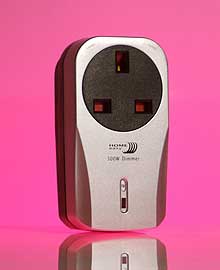 If you look on HomeEasy’s website, you’ll see a dizzying array of different products, and I was startled to discover that pretty much all of them were available on the B&Q stand. There were even some that don’t appear on the website. This caused me to have mild techno-acquisition panic, as I wanted to maximise the number of different toys I could play with whilst minimising the cost, just in case it all turned out to be a bag of old arse. After taking many combinations off the rack and putting them back again, sometimes in the wrong place (sometimes deliberately), I eventually emerged with a starter kit of two plugin dimmers, an in-line bayonet fitting on/off switch, the mid range remote (all for £39.98) and a ceiling rose dimmer module (£14.98). After munching a contemplative bacon and egg sarnie in the car park, I went back for a ‘switch converter’ (£19.98) – namely, one of those modules you put behind a switchplate to turn your existing switch into an RF dimmable affair.