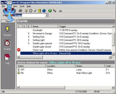 Events are one of the features that makes Homeseer so powerful. It allows X10 macros to be easily created, and even allows the PC to “talk” when something happens (“It’s getting dark, I’ll turn the lights on” for example!).