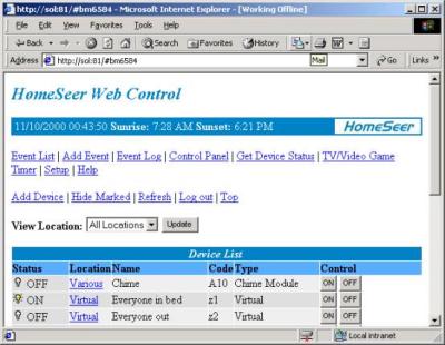 Because I used ASP extensively for work, I decided that I would create an ASP page on the IIS5 web server, which talked to Homeseer via COM. However, I could never get this to work, it appears that Homeseer creates another instance of itself when a COM “createObject” (or getObject) is called. From reading some of the Homeseer support web pages, it appears this is a common problem, and as far as I know, no one has yet found a way around this (if anyone finds out, please let me know!).