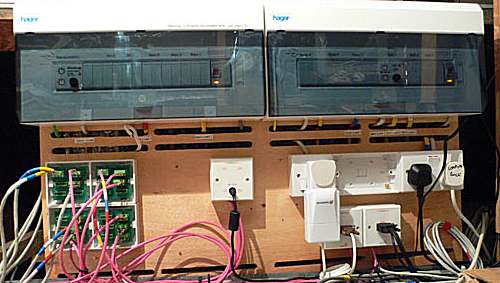 Here’s the whole set-up. The two Hager CUs were previously installed to allow all lighting to be star-wired, the original intent was to use DIN mounting X-10 modules. So this was done before UKHA2003, when I discovered Idratek.