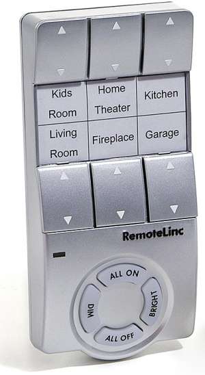 To control “linked” devices, you can tap one of the RemoteLinc’s buttons on or off, or you can hold a button to brighten or dim. Each of the six ON/OFF buttons on the RemoteLinc can be set up to control every light or just one light in the home remotely to create dramatic lighting scenes.