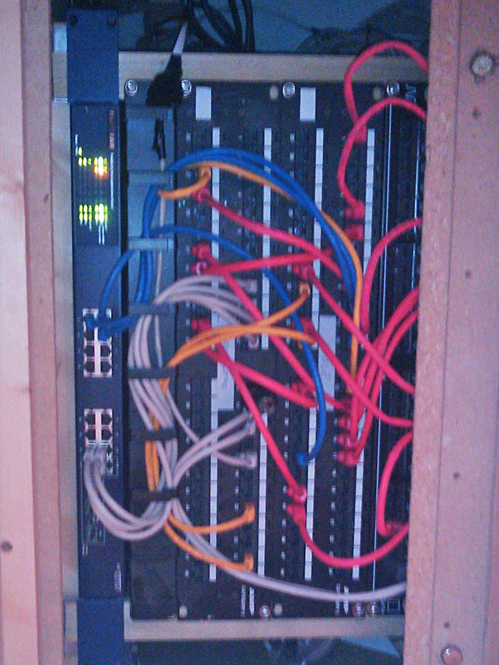 Having learned many valuable lessons / hints / tips from mailing list members over the years, when I’d originally run in all the CAT5 I’d left plenty of spare on all of the runs coiled up in the floor space. This turned out to be more than enough to un-patch everything from the old comms cabinet and bring the cables back down under the floor, along a few meters and then up into the aforementioned storage space – Node One was born!