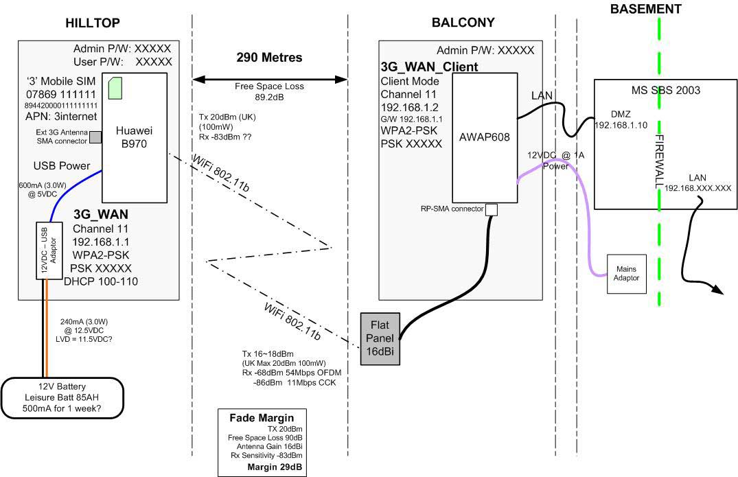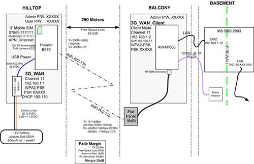The obvious thing to do was to use a 3G gateway at the hilltop and then have a point to point WiFi link back to the house. Power would initially be supplied by a leisure battery through a USB converter until a more suitable 230V supply could be provided. (That is another story…)