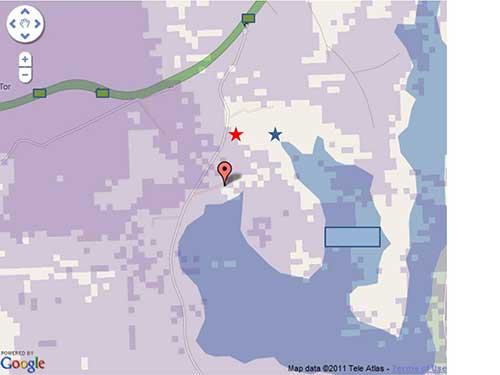 Coverage plot showing coverage of the ‘3’ network locally. The red star shows where we were able to get a signal. I have to congratulate ‘3’ on their prediction s/w. The Blue star shows were I live