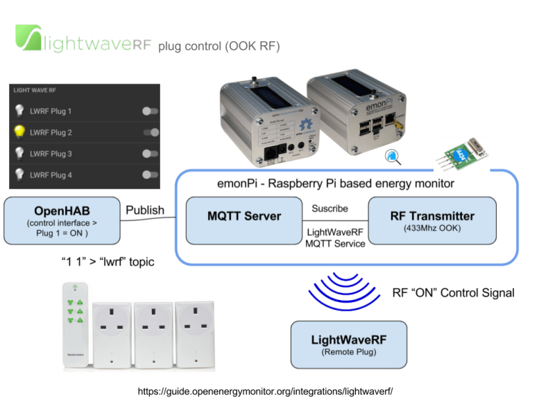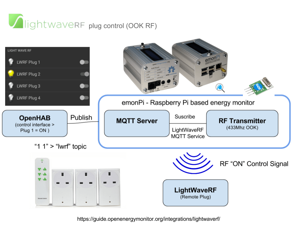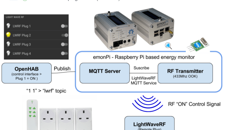 The emonPi can control LightWave RF devices directly via MQTT if an RF OOk modules is fitted. See LightWave RF emonPi User Guide.