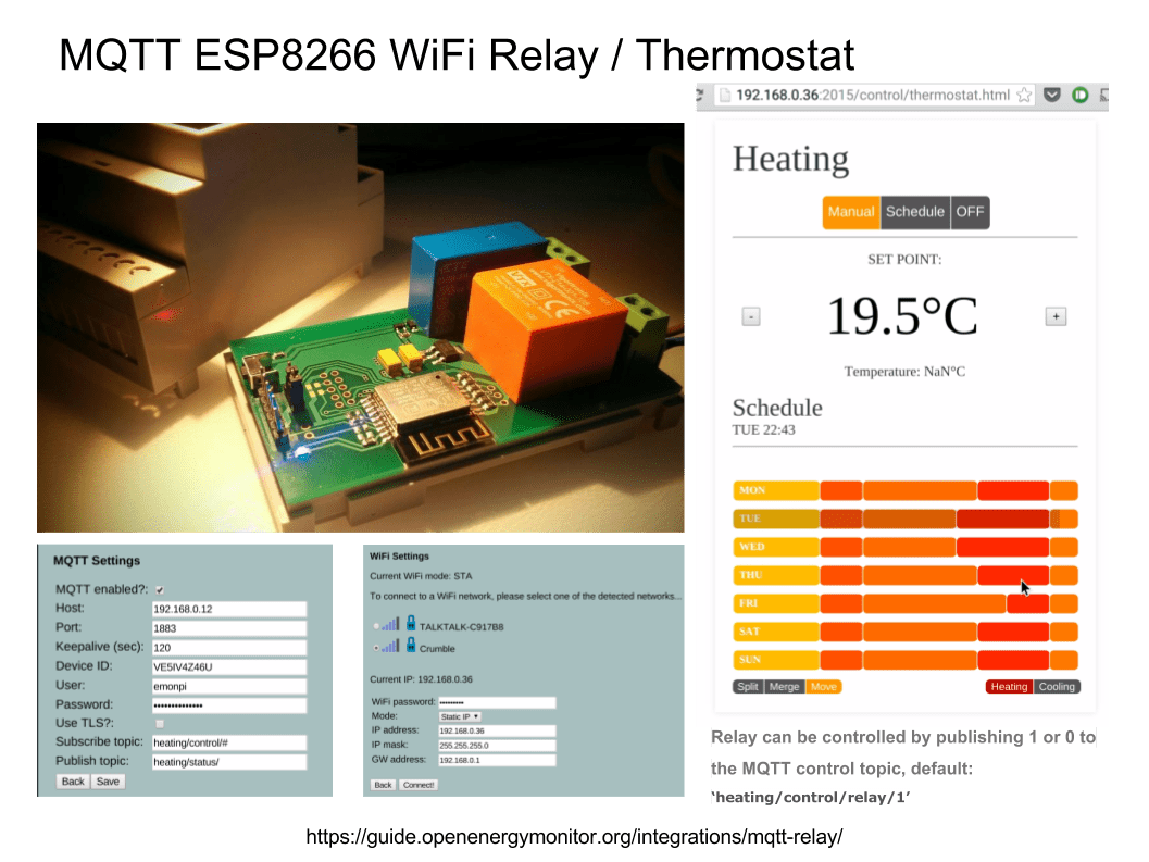 To control my gas central heating boiler I use an MQTT WiFi relay which also has a built in thermostat and scheduler, although I don’t use these features, I just control directly via MQTT. The WiFi Relay has been very reliable, it’s been used daily for the past two years in my home and never once required a reboot.