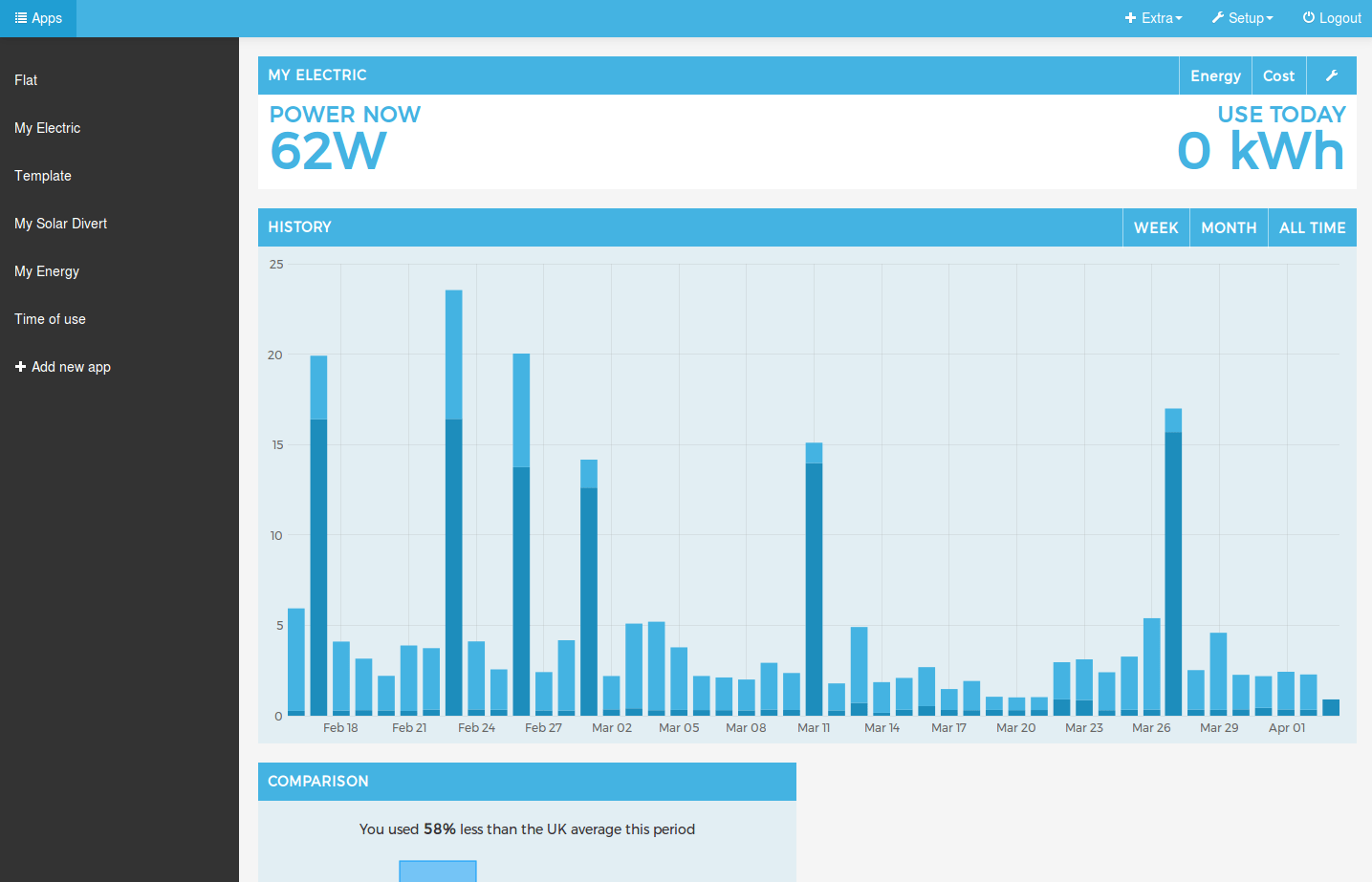 I have also recently enjoyed using the redesigned Emoncms Apps module which have just bee released on Emoncms.org. It’s now possible to have more than one MyElectric or MySolarPV ‘app’ per Emoncms account and Economy 7 split time of use tariffs are now supported (see forum thread):
