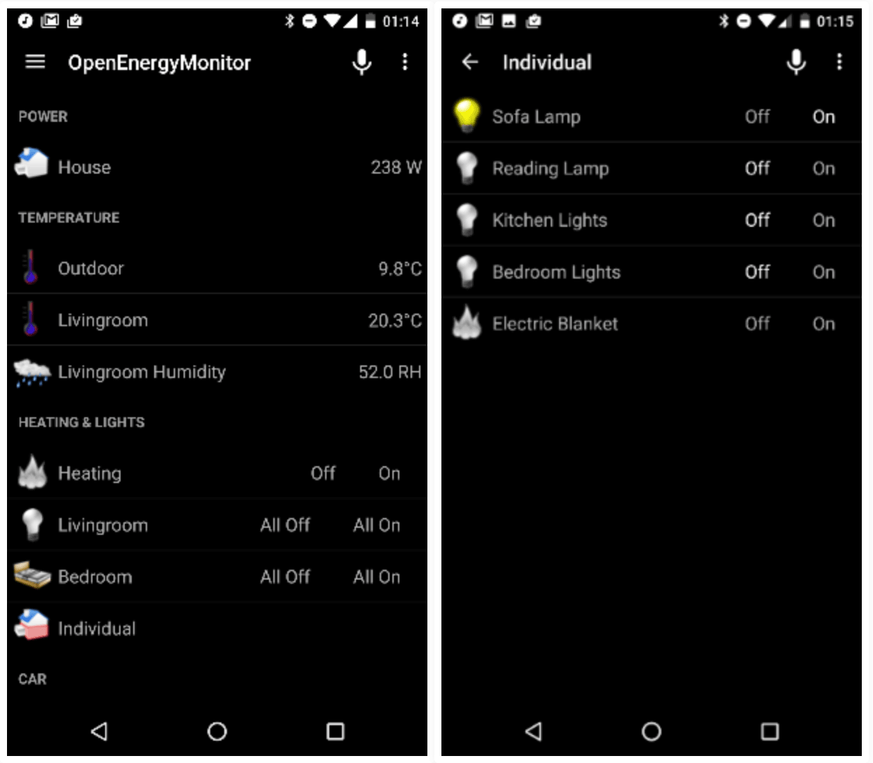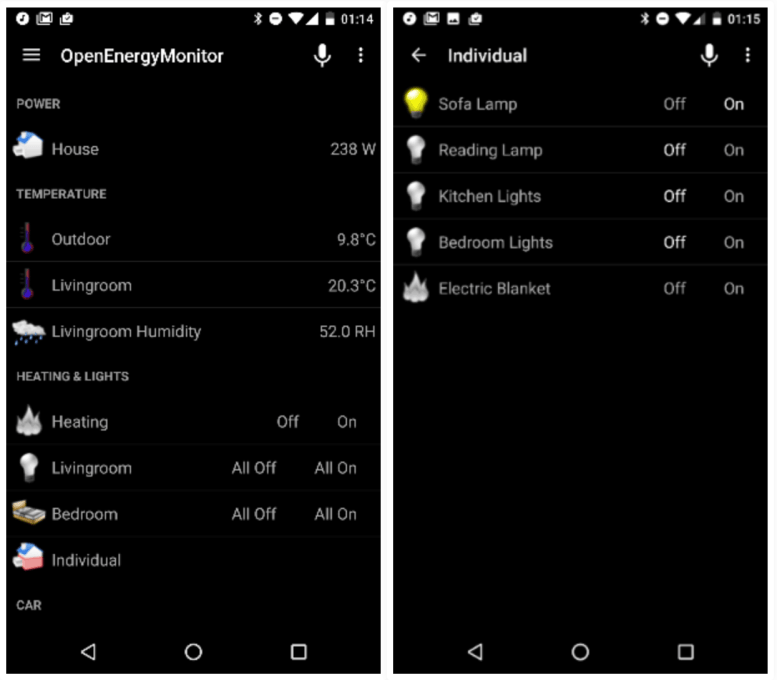 For the past few years I have been using OpenHAB as the control interface. OpenHAB is pre-loaded onto the emonPi emonSD pre-built image. I am yet to upgrade to OpenHAB V2.0, it looks very nice. However, V1.8 has been very reliable and fits my needs. I use the OpenHAB Android app to access the interface quickly from my phone: