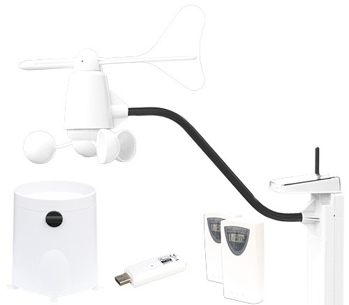 The Wind Gauge is powered by a solar panel and measures wind direction, wind velocity, wind gust, wind chill and temperature. The Rain Gauge measures, you guessed it, rainfall and the 2 Thermo-Hygro sensors can measure indoor / outdoor temperature and indoor / outdoor humidity.