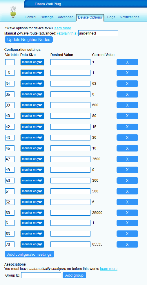 As usual with Fibaro devices, there are a whole host of configuration options (known as “parameters” in the Z-Wave world) that can change the behaviour of the wall plug. When I add devices to my Z-Wave network I always add the parameters to my Vera as “monitor only” in the first instance as this allows me to check and see what the defaults are and tweak them at a later point in time if required.