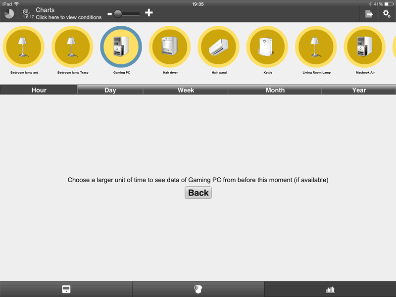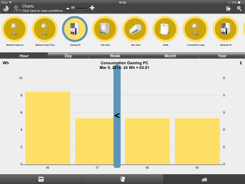 To end on a happier note, there is one more screen in the app that elevates itself above the standard user-interface tedium, and that’s the total power consumption screen, which you reach by tapping the unassuming little pie chart icon in the top left. What you get here is a pie chart that shows the aggregate total energy use, or the total per day, week, month or year. There’s a “now” tab too, but that never works and just hourglasses indefinitely. The “total” pie chart though, is exactly the sort of thing I wanted with which to berate the Mrs. Which is a pity, because (kettle aside) it shows that by far the biggest consumer is my gaming PC, even in standby.