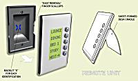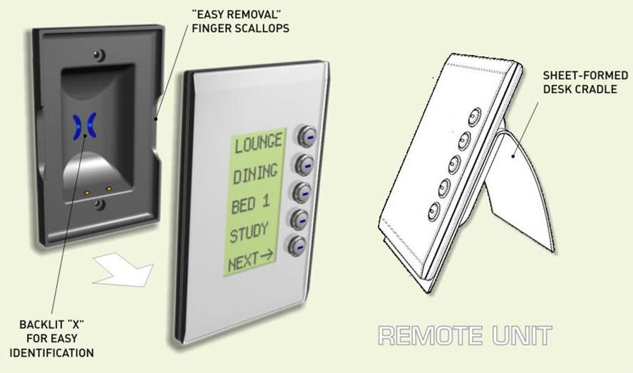 An interesting looking C-Bus Wireless version of the DLT switch is also planned. It removes from its docking stations in the wall (where it charges) so it can be carried around like a remote. There’s even a nice blue LED in the charger/docking station. (Update Dec 2005 – Clipsal UK have asked us to point out this device has still not been developed yet. Also if it is developed it will be an IR remote on a hardwired C-Bus Switch, not wireless)