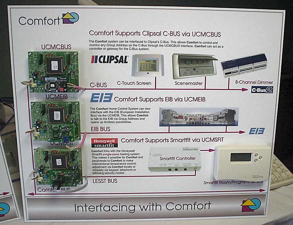 UKUSA [email protected] UKUSA Consulting showed three different products offering solutions for the integration of C-Bus, HomeVision and xAP in various combinations. xAP to C-Bus Gateway – A small standalone embedded controller to connect Clipsals C-Bus Lighting system to Ethernet via xAP. Production hardware was shown bridging between C-Bus and xAP using both BSC (Basic status and Control) and an enhanced lighting schema. The hardware uses a Rabbit processor with 512K RAM and 512K Flash memory and additionally provides three serial ports and some parallel I/O. An on board FTP and Web server allow for monitoring and control of C-Bus loads. Direct X10 connectivity may be offered later as an option to provide an embedded bridging solution between the two systems. The controller attaches directly to your C-Bus network and Ethernet. This allows full timed control and logic scheduling to be added to your C-Bus system via xAP using a xAP capable application such as HomeSeer, or even visual front end software like xAP Desktop. As an embedded solution it runs 24/7 without requiring a PC. C-Bus to HomeVision Macros – A new ROM was shown for HomeVision and HomeVision Pro that implements ‘Custom Lighting’. Along with a set of software macros this allows HomeVision to control C-Bus Lighting systems in much the same way as it currently supports X10. Named devices can be included in macros that control C-Bus groups and HomeVision will track event messages from C-Bus to maintain its state table in synch with C-Bus. C-Bus load change events can trigger a macro to provide logical sequencing of actions. HomeVision is attached directly to the C-Bus RS232 interface using one of HomeVisions serial ports. Availability will be coincident with the release from CSI of the HomeVision updated firmware ROMs which is any day now… C-Bus to HomeVision Hardware Bridge – A device utilising the same hardware as the xAP gateway but different firmware and providing control of C-Bus via Homevision macros as above. This hardware bridge has added benefits in terms of speed and memory usage within HomeVision and additionally provides constant synchronisation of C-Bus and the HomeVisions state table. Further software personalities may become available to add for example xAP , Caller ID or other I/O devices using the 3 spare serial ports. This device is attached to HomeVision via a dedicated serial port and directly attaches to C-Bus using an onboard interface. No RS232 C-Bus module is required. As an embedded solution it runs 24/7 as a companion to HomeVision without the need for a PC. This product is scheduled for availability in approx 10 weeks. Utilising the above alongside the newly announced xAP Desktop , xAP HomeSeer plugin and xAP Mapper application a time scheduler, logic scripting engine, web front end and innovative touchscreen environment was demonstrated integrating X10 , C-Bus, Barix, HomeVision, Phaedrus. mp3 and other hardware solutions. |