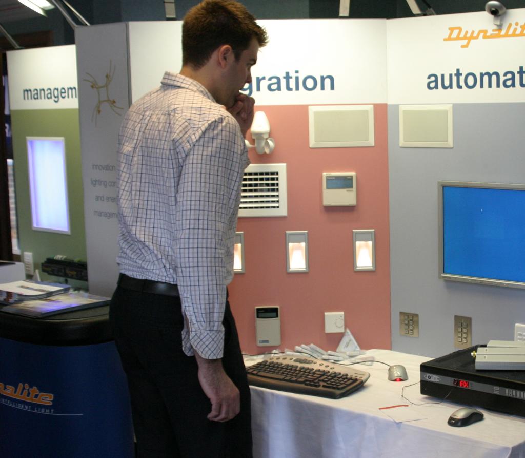 Australian company DynaLite had a very impressive stand at the show. The marketing blurb says “As an industry leader, Dynalite is committed to creating superior home automation, lighting control and energy management systems, setting new benchmarks in performance and efficiency. From a stock exchange in Shanghai, to a luxury resort in Dubai, from a smart home in Sao Paulo to limestone caves in New Zealand, Dynalite’s innovative solutions deliver Intelligent Light.” Rhys Quirk took me through their lighting system which has at its heart is a hard wired bus using RS485. A variety of products where on show, mainly lighting. Although the demo did include a newly developed IR source control from DynaLite switches. One of the scenarios shown was a wind speed sensor, linked to a relay control to bring down roller shutters in the even of a storm. An application perhaps more suited to a different climate than London, but the concept is of interest none the less. A new DynaLite module for driving LED lighting was shown too. It got lots of “ooo’s” and “aaah’s” from the visitors. We’re all suckers for LED lights. Dynalite appear to be rebuilding the brand in the UK after some recent restructuring. |