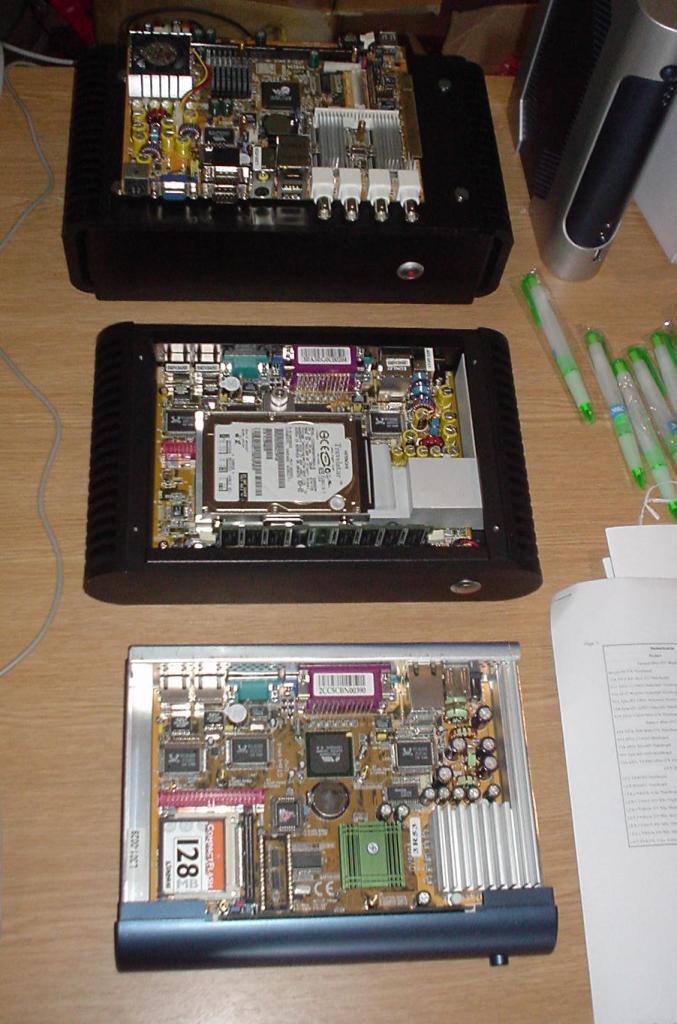 Brothers Nick and Chris Shore had one of the easiest jobs of the weekend – trying to interest the Home Automation brigade in tiny, sexy little PCs! Needless to say it was like shooting fish in barrel! Mini systems are all the rage currently. Whether you’re building a firewall to run off a CF card, or a PC for your living room, the tiny size, lack of noise, reduced running costs and cool styling are all points making tiny computers very cool. The Lex Light systems are often used as firewalls, but they are a great system for use as a home automation controller, with up to 3 network interfaces and up to 4 com ports, they can run from Compact Flash or 2.5″ hard drive. They had examples of the different VIA mainboards, these boards are 17cm square, and range from 533 MHz fanless up to 1.2 GHz. The top end boards include onboard graphics, S-Video TV-Out, 6 channel sound, SPDIF Out, Firewire, USB2.0, PCMCIA slot, Compact Flash slot and take up to a 1GB DDR DIMM. The MII boards with Duo-View can simultaneously display different images via the VGA and TV-out and can playback all DVD and DivX formats with ease. Pre-production samples of the LC-02, LC-05, and LC-06 Silverstone Lascala case were on display, these high quality cases are designed to take mini-ITX mainboards, and are finished in a gorgeus silver or gloss black finish which will go very well in that AV stack. These cases are now in production and are expected in stock at LinITX in the middle of June. The holy grail for a media playback system is a completely silent PC, and this can be achieved by the use of the E-Otonashi case, with its Heatlane technology, which allows you to build a completely fanless VIA EPIA M10000, MII 10000 or MII 12000 based system, this case can take a low-profile wireless LAN card, allowing the PC to be place anywhere rather than needing a wired network. LinITX displayed several Rack Mount systems. The one that got the most reaction was undoubtedly the 1U Lex quad! This one unit high case holds four separate PCs inside! Each board runs a C3 at 800 MHz and has 3 Network interfaces making them ideal for high density firewalls or servers. The case supports 4 2.5″ hard drives. Other cases were on show including the 1U 19″ Rackmount – 365mm deep – mini-ITX, the Travla C146 – 1U mini ITX case which can take 2 PCI cards and up to 4 hard drives and the Travla C147 – 1U dual mini-ITX case. A recent new addition to the LinITX on-line catalogue are the range of Lilliput VGA touchscreen. Available in 7″ widescreen and 8″ 4:3 configurations they have a range of applications from in car MP3/SatNav systems to monitors in racks where space is at a premium. |