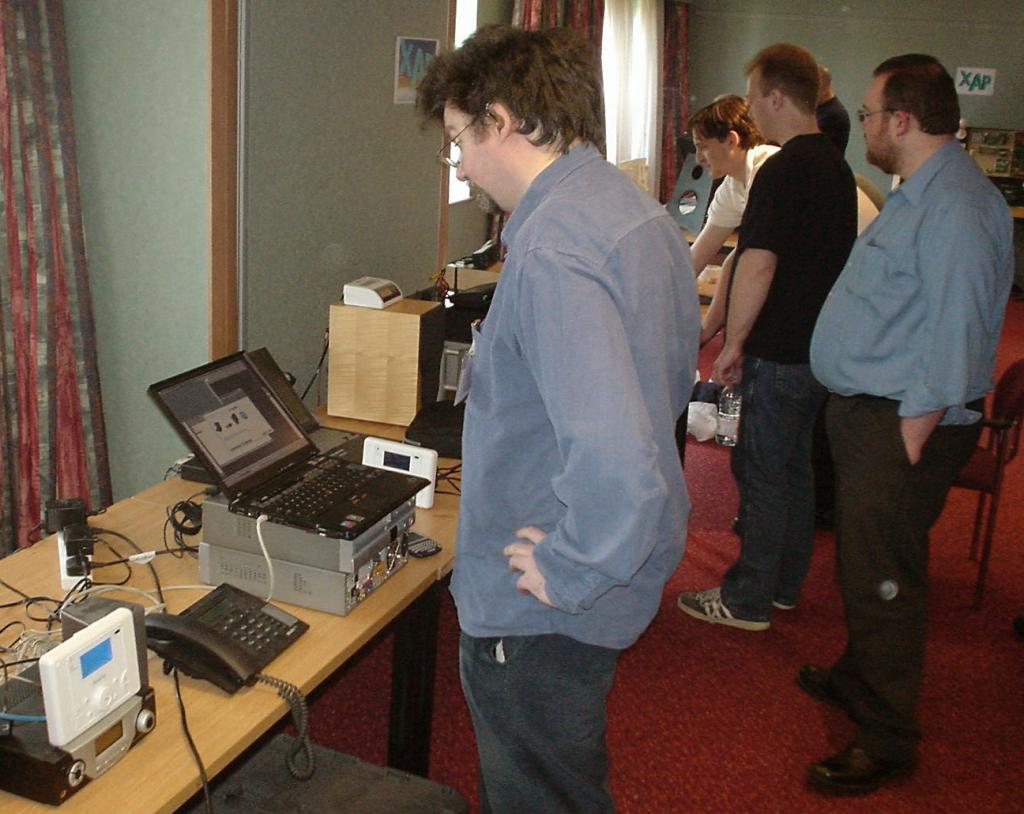 I got a brief look at the Cortex software from Idratek, and grabbed a photo of an xPL packet on their software. The marriage of xPL and Idratek has great, (to quote a buzz word) synergy. In one fell swoop the xPL guys have got themselves access to some superb hardware sensors, while at the same time Idratek have instantly given themselves access to the array of Products that xPL can control. The guys got their first look at Keiths latest version of the switcher on Saturday. They worked through Saturday night and by Sunday morning they were sending xPL messages round the LAN and controlling the switcher! This was very impressive to see. For xPL to grow it needs to be accessible to the masses. As Ian mentioned in his presentation, documentation is usually the last item to appear in such a project. So, If you have any talents in documenting install procedures or writing help files, why not join the team. |