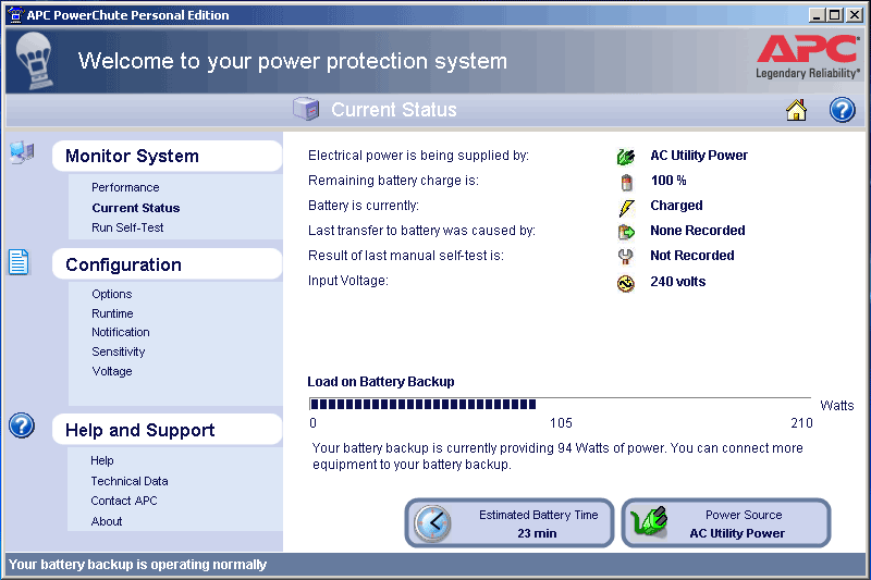 Our server consumes around 100 Watts and the APC software predicts around 25 minute running time on its battery. In our experience that will keep it up during most power cuts – a good 90% of which are of the ‘flicker’ or the off for a second or two and then back on variety. Importantly it protects the server from power surges too.