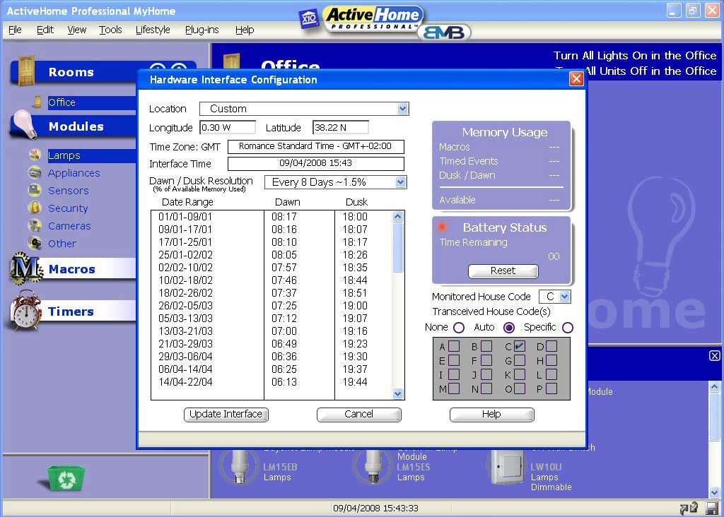 The first thing you’ll probably want to do is select Hardware Configuration from the Tools menu. Here you get to choose your location, the code you want the unit to monitor and which codes the unit will respond to via RF. Annoyingly you can only monitor one house code. This is for status tracking and use as a condition for macros. It would be nice to be able to select more than one house code like you can for the RF.