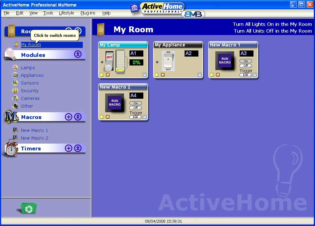 The screen is split into 3 main areas. Rooms, Modules, Timers and Macros on the left with a small dustbin just below this. On the right is the main display screen this area changes depending on what is displayed. So click on a room and this is displayed in the main area, then click on modules and this gets displayed below the room.
