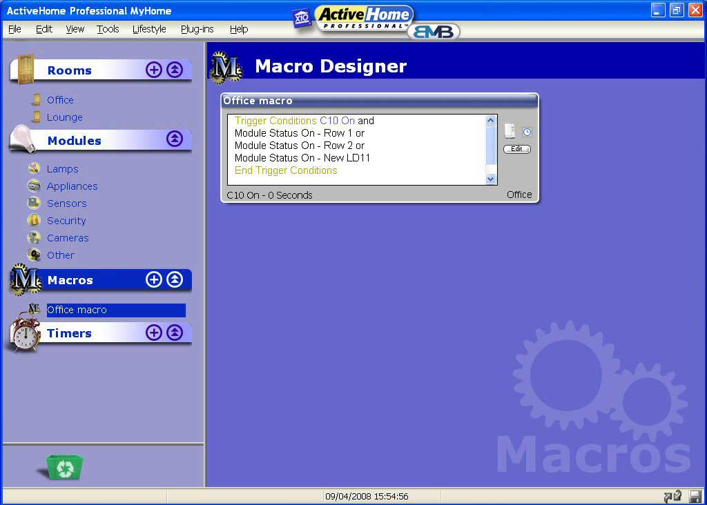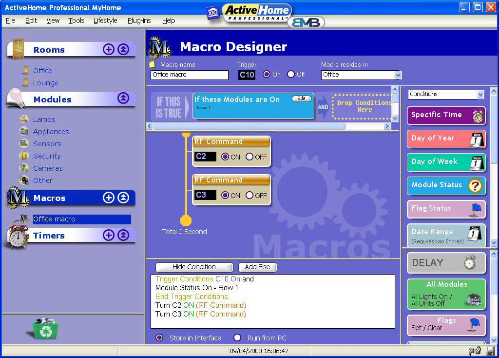 Like adding modules the interface is drag and drop. Select the condition and drag it into the condition window. If you want to use module status for a condition then only the modules with the monitored house code can be used. But there is a way round this. So say your monitored house code is C but you want to have a condition that looks at the status of module A1. You set up a macro to set a flag every time you switch A1 on and clear the flag every time you switch A1 off. Now you set up another macro which when triggered will look to see if A1 is on or off and if it’s on it switches C1 on.