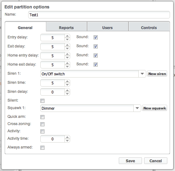 A partition can also have ‘cross zoning’ applied: this means that the alarm will not activate based on the output of a single sensor, unless it is corroborated within a certain time period by a different sensor, which should help alleviate false alarms. The final option is what Zipato amusingly refer to as “ALDERLY CARE”: there is a tick box marked ‘activity’ and a corresponding ‘activity time’ option, which if set will trigger the alarm if no activity from any of its zones has been seen within the activity time — in other words, a handy means of keeping track of aged relatives.